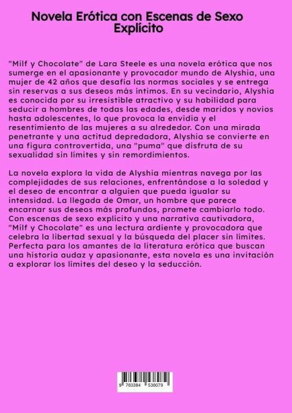"Milf y Chocolate" de Lara Steele es una novela erótica que nos sumerge en el apasionante y provocador mundo de Alyshia, una mujer de 42 años que desafía las normas sociales y se entrega sin reservas a sus deseos más íntimos. En su vecindario, Alyshia es conocida por su irresistible atractivo y su habilidad para seducir a hombres de todas las edades, desde maridos y novios hasta adolescentes, lo que provoca la envidia y el resentimiento de las mujeres a su alrededor. Con una mirada penetrante y una actitud depredadora, Alyshia se convierte en una figura controvertida, una "puma" que disfruta de su sexualidad sin límites y sin remordimientos.La novela explora la vida de Alyshia mientras navega por las complejidades de sus relaciones, enfrentándose a la soledad y el deseo de encontrar a alguien que pueda igualar su intensidad. La llegada de Omar, un hombre que parece encarnar sus deseos más profundos, promete cambiarlo todo. Con escenas de sexo explícito y una narrativa cautivadora, "Milf y Chocolate" es una lectura ardiente y provocadora que celebra la libertad sexual y la búsqueda del placer sin límites. Perfecta para los amantes de la literatura erótica que buscan una historia audaz y apasionante, esta novela es una invitación a explorar los límites del deseo y la seducción.