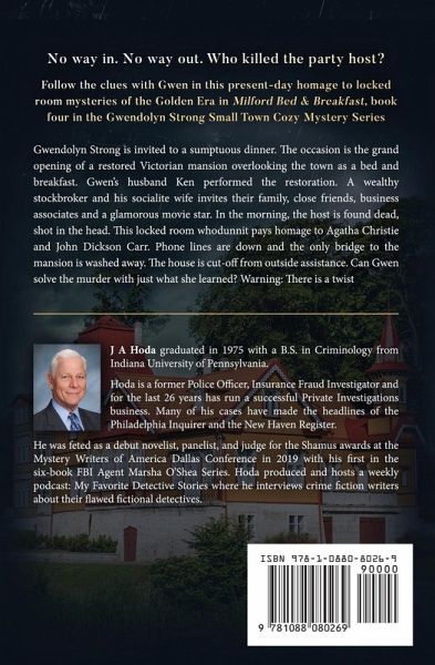 No way in. No way out. Who killed the party host? Follow the clues with Gwen in this present-day homage to locked room mysteries of the Golden Era in Milford Bed & Breakfast, book four in the Gwendolyn Strong Small Town Cozy Mystery Series Gwendolyn Strong is invited to a sumptuous dinner. The occasion is the grand opening of a restored Victorian mansion overlooking the town as a bed and breakfast. Gwen's husband Ken performed the restoration. A wealthy stockbroker and his socialite wife invites their family, close friends, business associates and a glamorous movie star. In the morning, the host is found dead, shot in the head. This locked room whodunnit pays homage to Agatha Christie and John Dickson Carr. Can Gwen solve his murder? Phone lines are down and the only bridge to the mansion is washed away. The house is cut-off from outside assistance. Can Gwen solve the murder with just what she learned? Warning: There is a twist