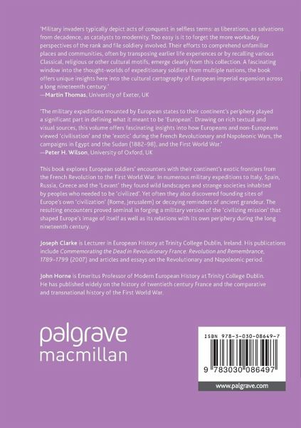 1. Introduction: Peripheral Visions - Militarized Cultural Encounters in the Long Nineteenth Century; Joseph Clarke and John Horne.- Part I: Encounters.- 2. French Soldiers and the Revolutionary Origins of the Colonial Mind; Fergus Robson.- 3. Encountering the Sacred: British and French Soldiers in the Revolutionary and Napoleonic Mediterranean; Joseph Clarke.- 4. Violence and the Barbaric East: Germans and the Russian Campaign of 1812; Leighton S. James.- 5. Kodaking a Just War: Photography, Architecture and the Language of Damage in the Egyptian Sudan, 1884-1898; Paul Fox.- 6. Rise Phoenix-like: British Soldiers, Civilization and the First World War in Greek Macedonia, 1915-1918; Justin Fantauzzo.- Part II: Counter-Encounters.- 7. A Crisis of Images: The French, Jihad, and the Plague in Upper Egypt, 1798-1801; Zeinab Abul-Magd.- 8. 'Their Lives Have Become Ours': Counter-Encounters in Mesopotamia, 1915-1918; Santanu Das.- Part III: Capturing Landscapes.- 9. Military Wars of Seeing: British Soldiers' Sketches from the Egyptian Campaign of 1801; Catriona Kennedy.- 10. Edgy Encounters in North Africa and the Balkans: R. C. Woodville's Pictures of Conflict-Zone life for the Illustrated London News, 1880-1903; Tom Gretton.- 11. Imagined Landscapes in Palestine during the Great War; Jennifer Wellington.- Part IV: Power and Patrimonies.- 12. Constructing A Literary Memory of the 1812 Russian Campaign in German Central Europe in the Long Nineteenth Century; Leighton S. James and Sheona Davies.- 13. Archaeology and Monument Protection in War: The Collaboration between the German Army and Researchers in the Ottoman Empire, 1914-1918; Oliver Stein.- 14. A 'Civilizing Work'? The French Army in Macedonia, 1915-1918; John Horne.- 15. The 'Hole-y' City: British Soldiers' Perceptions of Jerusalem during its Occupation 1917-1920; Mahon Murphy.- Index.