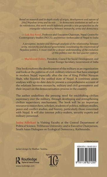 This book explores the development of the military as an organization and looks at the patterns of civil-military relations that have emerged in modern Nepal, especially after the rise of King Prithvi Narayan Shah, who founded the unified state of Nepal. It combines astute analyses with up-to-date data to present a comprehensive account of the relations between monarchy, military and civil government and their impact on the democratization process in the country. The author underlines the pressing need for establishing civilian supremacy over the military, through developing and strengthening civilian supervisory mechanisms. The book will be an important resource to researchers, scholars, students of politics, military studies, peace and conflict studies, and history, particularly those concerned with Nepal. It will also interest policy-makers, security experts and military personnel.