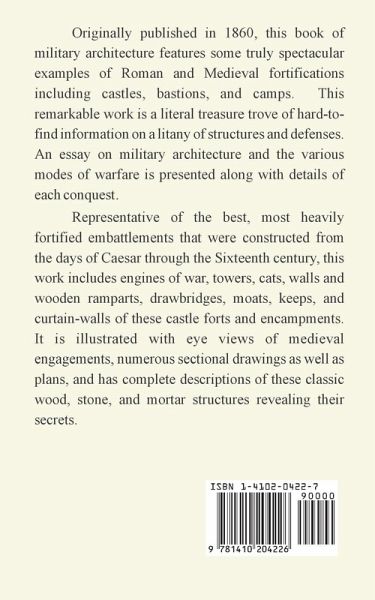 Originally published in 1860, this book of military architecture features some truly spectacular examples of Roman and Medieval fortifications including castles, bastions, and camps. This remarkable work is a literal treasure trove of hard-to-find information on a litany of structures and defenses. An essay on military architecture and the various modes of warfare is presented along with details of each conquest. Representative of the best, most heavily fortified embattlements that were constructed from the days of Caesar through the Sixteenth century, this work includes engines of war, towers, cats, walls and wooden ramparts, drawbridges, moats, keeps, and curtain-walls of these castle forts and encampments. It is illustrated with eye views of medieval engagements, numerous sectional drawings as well as plans, and has complete descriptions of these classic wood, stone, and mortar structures revealing their secrets.