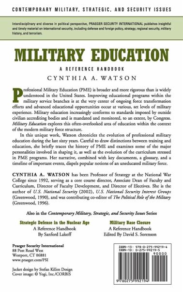 Professional Military Education (PME) is broader and more rigorous than is widely understood in the United States. Improving educational programs within the military service branches is at the very center of ongoing force transformation efforts and advanced educational opportunities occur at various, set levels of military experience. Military education increasingly conforms to standards imposed by outside civilian accrediting bodies and is mandated and monitored, to an extent, by Congress. Military Education explores this often-overlooked area of education within the context of the modern military force structure. In this unique work, Watson chronicles the evolution of professional military education during the last sixty years. Careful to draw distinctions between training and education, she briefly traces the history of PME and examines some of the major personalities involved in shaping it, as well as the evolution of the curriculum stressed in PME programs. Her narrative, combined with key documents, a glossary, and a timeline of important events, dispels popular notions of an uneducated military force.