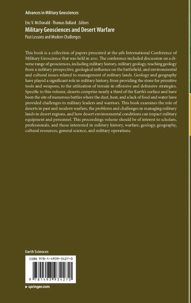 Preface.- 'An Unfortunate Accident of Geography': Badlands and the ANZAC Sector, Gallipoli, April-December 1915.- From Army Outpost to Global Military Installations: How WW2 Transformed the Military Presence in the Southwestern United States.- Preparing for War in the Desert Southwest; From the California - Arizona Maneuver Area to the Yuma Test Branch (and beyond).- The Influence of Physical Geography on the Battle Of Kasserine Pass, Tunisia 1943.- The Influence of Geology And Geography on the Indian Wars in Eastern Washington Territory.- Teaching Military Geoscience in the 21st Century Classroom: Virtual Field Explorations of the Gettysburg Battlefield.- Fort Fisher North Carolina Past and Present: A Geospatial Analysis using LiDAR and GIS.- There's Uranium in Them Hills: The Archaeology of Nevada's Uranium Boom.- Military Development and Geographic Change on San Diego Bay.- High Density Metal Contaminant Transport in Arid Region Ephemeral Channels.- Comparing Playa Inundation Estimates From Landsat and LiDar Data to a Doppler Radar-Based Hydrologic Model.- Environmental Security and Trans-Boundary Water Resources.- Environmental Reporting in the South African Department of Defense and Military Veterans.- Operation Iraqi Freedom (OIF) and the Use of Forwarding Operating Bases (FOBs).- U.S. Army Agriculture Development Teams, Afghanistan: The Role of the Geoscientist.- Regional Distribution of Salt-Rich Dust Across Southwest Asia Based on Predictiv