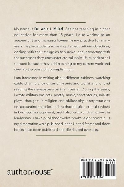 My name is Dr. Anis I. Milad. Besides teaching in higher education for more than 15 years, I also worked as an accountant and manager/owner in my practice for many years. Helping students achieving their educational objectives, dealing with their struggles to survive, and interacting with the successes they encounter are valuable life experiences I treasure because they add meaning to my current work and give me the sense of accomplishment. I am interested in writing about different subjects, watching cable channels for entertainments and world affairs, and reading the newspapers on the Internet. During the years, I wrote military projects, poetry, music, short stories, minute plays, thoughts in religion and philosophy, interpretations on accounting theories and methodologies, critical reviews in business management, and I also wrote critical reviews in leadership. I have published twelve books, eight books plus my dissertation were published in the United States and three books have been published and distributed overseas.