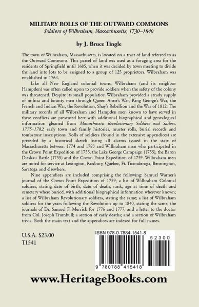 The town of Wilbraham, Massachusetts, is located on a tract of land referred to as the Outward Commons. This parcel of land was used as a foraging area for the residents of Springfield until 1685, when it was decided by town meeting to divide the land into lots to be assigned to a group of 125 proprietors. Wilbraham was established in 1763. Like all New England colonial towns, Wilbraham (and its neighbor Hampden) was often called upon to provide soldiers when the safety of the colony was threatened. Despite its small population Wilbraham provided a steady supply of militia and bounty men through Queen Anne's War, King George's War, the French and Indian War, the Revolution, Shay's Rebellion and the War of 1812. The military records of all Wilbraham and Hampden men known to have served in these conflicts are presented here with additional biographical and genealogical information gleaned from Massachusetts Revolutionary Soldiers and Sailors, 1775-1782, early town and family histories, muster rolls, burial records and tombstone inscriptions. Rolls of soldiers (found in the extensive appendices) are preceded by a historical sketch listing all alarms issued in the state of Massachusetts between 1774 and 1783 and Wilbraham men who participated in the Crown Point Expedition of 1755, the Lake George Campaign (1755), the Baron Dieskau Battle (1755) and the Crown Point Expedition of 1759. Wilbraham men are noted for service at Lexington, Roxbury, Quebec, Ft. Ticonderoga, Bennington, Saratoga and elsewhere. Nine appendices are included comprising the following: Samuel Warner's journal of the Crown Point Expedition of 1759; a list of Wilbraham Colonial soldiers, stating date of birth, date of death, rank, age at time of death and cemetery where buried, with additional biographical information wherever known; a list of Wilbraham Revolutionary soldiers, stating the same; a list of Wilbraham soldiers for the years following the Revolution up to 1840, stating the same; the journals of Dr. Samuel F. Merrick for 1776 and 1777, and a letter to the doctor from Col. Joseph Trumbull; a section of early deaths; and a section of Wilbraham trivia. Both the main text and the appendices are indexed for full names.