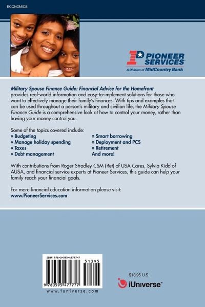 A Military Spouse Finance Guide: Financial Advice for the Homefront provides real-world information and easy-to-implement solutions for those who want to effectively manage their family's finances. With tips and examples that can be used throughout a person's military and civilian life, the Military Spouse Finance Guide is a comprehensive look at how to control your money, rather than having your money control you. Some of the topics covered include: Budgeting The different forms of borrowing Types of lending to avoid How to manage holiday spending Deployment and PCS financial issues Taxes Retirement And more! With contributions from Command Sergeant Major Roger Stradley, U.S. Army (retired)-founder of USA Cares-and Sylvia Kidd, Director, Family Programs, The Association of the United States Army, this guide can help your family reach your financial goals. For more financial education information please visit: www.PioneerServices.com
