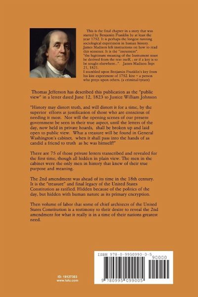 On June 12,1823 Thomas Jefferson quilled the following "History may distort truth, and will distort it for a time, by the superior efforts at justification of those who are conscious of needing it most. Nor will the opening scenes of our present government be seen in their true aspect, until the letters of the day, now held in private hoards, shall be broken up and laid open to public view. What a treasure will be found in General Washington's cabinet, when it shall pass into the hands of as candid a friend to truth as he was himself!" This volume of work is the "public view" he speaks of because ALL interpretations of the 2nd Amendment have exploited history to re-author its meaning. This full story is told with the hoarded letters spanning 84 years and their treasure ultimately revealed by the "Candid a friend of Truth". The 2nd amendment was crafted ahead of its time and its time has finally arrived. It is literally the Holy Grail of Gun Control and the final legacy of the United States Constitution.