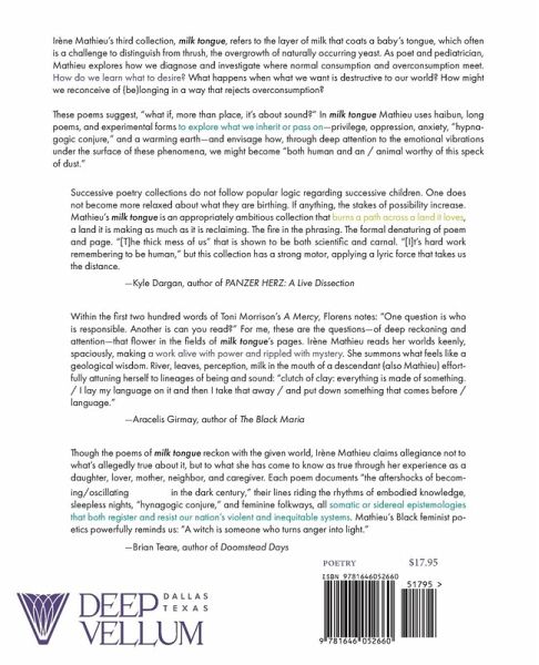 "Milk Tongue refers to the layer of milk that coats a baby's tongue, which often is a challenge to distinguish from thrush, the overgrowth of naturally occurring yeast. As poet and pediatrician, Mathieu explores how we diagnose and investigate where normal consumption and overconsumption meet. How do we learn what to desire? What happens when what we want is destructive to our world? How might we reconceive of (be)longing in a way that rejects overconsumption? These poems suggest, "what if, more than place, it's about sound?" In Milk Tongue Mathieu uses haibun, long poems, and experimental forms to explore what we inherit or pass on - privilege, oppression, anxiety, "hypnagogic conjure," and a warming earth - and envisage how, through deep attention to the emotional vibrations under the surface of these phenomena, we might become "both human and an / animal worthy of this speck of dust.""--