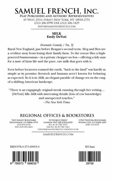 Dramatic Comedy Characters: 3 male, 3 female Rural New England, just before Reagan's second term. Meg and Ben are a creditor away from losing their family farm. To the rescue flies a high-powered businessman - in a private chopper no less - offering a tidy sum for a taste of farm life and the pure, raw milk that goes with it. Even before locavores roamed the earth, "back to the land" was hardly as simple as its promise; livestock and humans aren't known for behaving as expected. And so it