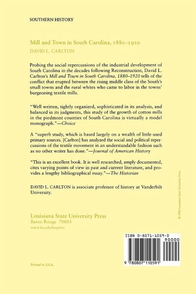 Probing the social repercussions of the industrial development of South Carolina in the decades following Reconstruction, David L. Carlton's Mill and Town in South Carolina, 1880-1920, tells of the conflict that erupted between the rising middle class of the South's small towns and the rural white who came to labor in the towns' burgeoning textile mills. The townsmen who built the mills initially expected no social friction to result from industrialization, since the work force was to consist entirely of white "Anglo-Saxons" like themselves. However, as thousands of rural whites moved into the mill villages at the turn of the century, their backwoods independence proved increasingly incompatible with the orderly, hierarchial outlook of the town people. As a result, the town people soon abandoned their belief in white equality and instead began to view the mill people as backward folk needing to be brought under the control of their betters. In keeping with the spirit of the Progressive era, the principal approach of the town people to the task of "uplifting" the mill people was through education. Through the creation of child labor and compulsory education laws they hoped to free the mill child from the hold of his parents and cement his allegiance to the new, more progressive world being forged under town leadership. This assault met with resentment and some opposition from the mill population, but the workers could put up little effective resistance until they were organized by the "demagogue" Cole Blease, whom they then helped to be elected governor in 1910. Blease's ascendancy, however, was brief. A progressive electoral victory in 1914 resulted in a new surge of reform, and by 1920 the use of the state government to "uplift" the poorer whites was an established practice. Tracing the social impact of southern industrialization from its beginnings to the ruse of the demagogue politicians of the early twentieth century, this study by David L. Carlton isolates the role of the textile mills in bringing increased rigidity and tension to the loose social structure of the preindustrial South. David L. Carlton grew up in a mill village in South Carolina and is associate professor of history at Vanderbilt University. For more information about the author, please visit his website at: www.vanderbilt.edu/AnS/history/carltodl/carltodl.htm