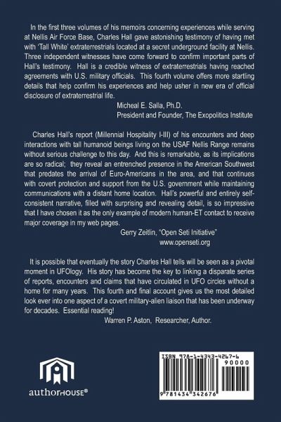 In the first three volumes of his memoirs concerning experiences while serving at Nellis Air Force Base, Charles Hall gave astonishing testimony of having met with 'Tall White' extraterrestrials located at a secret underground facility at Nellis. Three independent witnesses have come forward to confirm important parts of Hall's testimony. Hall is a credible witness of extraterrestrials having reached agreements with U.S. military officials. This fourth volume offers more startling details that help confirm his experiences and help usher in new era of official disclosure of extraterrestrial life. Micheal E. Salla, Ph.D. President and Founder, The Exopolitics Institute Charles Hall's report (Millennial Hospitality I-III) of his encounters and deep interactions with tall humanoid beings living on the USAF Nellis Range remains without serious challenge to this day. And this is remarkable, as its implications are so radical; they reveal an entrenched presence in the American Southwest that predates the arrival of Euro-Americans in the area, and that continues with covert protection and support from the U.S. government while maintaining communications with a distant home location. Hall's powerful and entirely self-consistent narrative, filled with surprising and revealing detail, is so impressive that I have chosen it as the only example of modern human-ET contact to receive major coverage in my web pages. Gerry Zeitlin, "Open Seti Initiative" www.openseti.org It is possible that eventually the story Charles Hall tells will be seen as a pivotal moment in UFOlogy. His story has become the key to linking a disparate series of reports, encounters and claims that have circulated in UFO circles without a home for many years. This fourth and final account gives us the most detailed look ever into one aspect of a covert military-alien liaison that has been underway for decades. Essential reading! Warren P. Aston, Researcher, Author.
