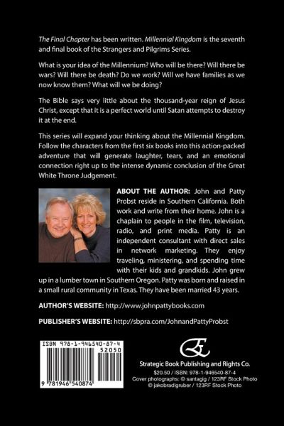 The Final Chapter has been written. Millennial Kingdom is the seventh and final book of the Strangers and Pilgrims Series. What is your idea of the Millennium? Who will be there? Will there be wars? Will there be death? Do we work? Will we have families as we now know them? What will we be doing? The Bible says very little about the thousand-year reign of Jesus Christ, except that it is a perfect world until Satan attempts to destroy it at the end. This series will expand your thinking about the Millennial Kingdom. Follow the characters from the first six books into this action-packed adventure that will generate laughter, tears, and an emotional connection right up to the intense dynamic conclusion of the Great White Throne Judgement. About the Author: John and Patty Probst reside in Southern California. Both work and write from their home. John is a chaplain to people in the film, television, radio, and print media. Patty is an independent consultant with direct sales in network marketing. They enjoy traveling, ministering, and spending time with their kids and grandkids. John grew up in a lumber town in Southern Oregon. Patty was born and raised in a small rural community in Texas. They have been married 43 years. Author's website: http://www.johnpattybooks.com Publisher's website: http://sbpra.com/JohnandPattyProbst