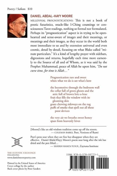MILLENNIAL PROGNOSTICATIONS: This is not a book of poetic futuristics, oracle-like I-Ching countings or consciousness Tarot readings, nothing so formal nor formulated. Perhaps its "prognostication" aspect is in trying to be open-hearted and sense-aware of images and their meanings, or meanings and their images, as they occur in the world both most immediate to us and by extension universal and even cosmic, detail by detail, focusing on what Blake called "minute particulars." It's a kind of lengthy prayer with sidebars, digressions and returns, hopefully each time more earnestly to the Source of all and of Whom, as it was said by the Prophet Muhammad, peace of Allah be upon him, "Do not curse time, for time is Allah..."