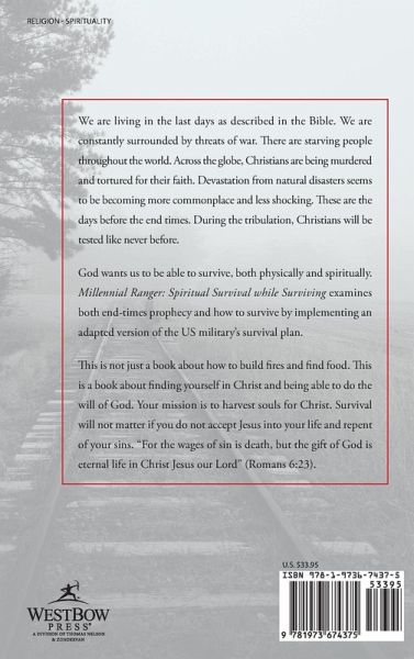 We are living in the last days as described in the Bible. We are constantly surrounded by threats of war. There are starving people throughout the world. Across the globe, Christians are being murdered and tortured for their faith. Devastation from natural disasters seems to be becoming more commonplace and less shocking. These are the days before the end times. During the tribulation, Christians will be tested like never before. God wants us to be able to survive, both physically and spiritually. Millennial Ranger: Spiritual Survival while Surviving examines both end-times prophecy and how to survive by implementing an adapted version of the US military's survival plan. This is not just a book about how to build fires and find food. This is a book about finding yourself in Christ and being able to do the will of God. Your mission is to harvest souls for Christ. Survival will not matter if you do not accept Jesus into your life and repent of your sins. "For the wages of sin is death, but the gift of God is eternal life in Christ Jesus our Lord" (Romans 6:23).