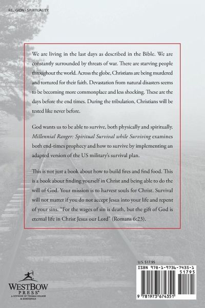 We are living in the last days as described in the Bible. We are constantly surrounded by threats of war. There are starving people throughout the world. Across the globe, Christians are being murdered and tortured for their faith. Devastation from natural disasters seems to be becoming more commonplace and less shocking. These are the days before the end times. During the tribulation, Christians will be tested like never before. God wants us to be able to survive, both physically and spiritually. Millennial Ranger: Spiritual Survival while Surviving examines both end-times prophecy and how to survive by implementing an adapted version of the US military's survival plan. This is not just a book about how to build fires and find food. This is a book about finding yourself in Christ and being able to do the will of God. Your mission is to harvest souls for Christ. Survival will not matter if you do not accept Jesus into your life and repent of your sins. "For the wages of sin is death, but the gift of God is eternal life in Christ Jesus our Lord" (Romans 6:23).