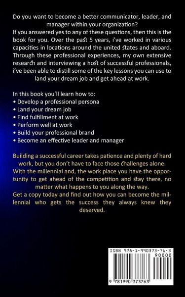 Do you want to become a better communicator, leader, and manager within your organization? If you answered yes to any of these questions, then this is the book for you. Over the past 5 years, i've worked in various capacities in locations around the united states and aboard. Through these professional experiences, my own extensive research and interviewing a host of successful professionals, i've been able to distill some of the key lessons you can use to land your dream job and get ahead at work. In this book you'll learn how to:Develop a professional persona Land your dream job Find fulfillment at work Perform well at work Build your professional brand Become an effective leader and manager Building a successful career takes patience and plenty of hard work, but you don't have to face those challenges alone. With the millennial and, the work place you have the opportunity to get ahead of the competition and stay there, no matter what happens to you along the way. Get a copy today and find out how you can become the millennial who gets the success they always knew they deserved.