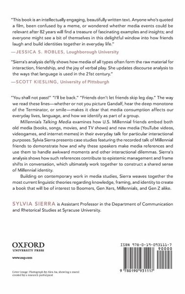 "Friends don't let friends skip leg day." "You shall not pass!" "I'll be back." The way we read these lines-whether or not you picture Gandalf, hear the deep monotone of the Terminator, or smile-makes it clear that media consumption affects our everyday lives, language, and how we identify as part of a group. Millennials Talking Media examines how U.S. Millennial friends embed both old media (books, songs, movies, and TV shows) and new media (YouTube videos, videogames, and internet memes) in their everyday talk for particular interactional purposes. Sylvia Sierra presents case studies featuring the recorded talk of Millennial friends to demonstrate how and why these speakers make media references and use them to handle awkward moments and other interactional dilemmas. Sierra's analysis shows how such references contribute to epistemic management and frame shifts in conversation, which ultimately work together to construct a shared sense of Millennial identity. Building on contemporary work in media studies, Sierra weaves together the most current linguistic theories regarding knowledge, framing, and identity to create a book that will be of interest to Boomers, Gen Xers, Millennials, and Gen Z alike.