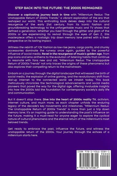 Step Back into the Future: The 2000s Reimagined Discover a captivating journey back in time with "Millennium Redux: The Unstoppable Return of 2000s Trends," a vibrant exploration of the era that reshaped our world. This enthralling book delves deep into the cultural resurgence of the early 21st century, from its iconic fashion and groundbreaking technology to the unforgettable music and TV shows that defined a generation. Whether you lived through the glitter and glam of the 2000s or are experiencing its revival through the eyes of Gen Z, this masterpiece offers a nostalgic trip down memory lane paired with a fresh perspective on its lasting impact. Witness the rebirth of Y2K fashion as low-rise jeans, cargo pants, and chunky accessories dominate the runway once again, guided by the powerful influence of social media. Revel in the resurgence of music's golden age, from pop icons and emo anthems to the evolution of listening habits that continue to resonate with fans new and old. "Millennium Redux: The Unstoppable Return of 2000s Trends" not only traces the origins of these phenomena but also explores their compelling return to the mainstream. Embark on a journey through the digital landscape that witnessed the birth of social media, the explosion of online gaming, and the revolutionary shift from dial-up internet to the connected world we inhabit today. This book meticulously chronicles the technological advancements and social media pioneers that paved the way for the digital age, offering invaluable insights into how the 2000s laid the foundation for contemporary society's daily life and communication. But it doesn't stop there. Dive into the heart of 2000s reality TV, activism, internet culture, and much more, as each chapter unfolds the enduring legacy of the decade's key movements and milestones. "Millennium Redux: The Unstoppable Return of 2000s Trends" is more than just a trip down memory lane; it's an inspiring guide to understanding the past's influence on the future, making it a must-read for anyone eager to explore the cyclical nature of cultural phenomena and the eternal return of the millennium's most beloved trends. Get ready to embrace the past, influence the future, and witness the unstoppable return of the 2000s. Your journey through the echoes of a millennium starts here.