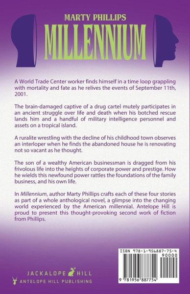 A World Trade Center worker finds himself in a time loop grappling with mortality and fate as he relives the events of September 11th, 2001. The brain-damaged captive of a drug cartel mutely participates in an ancient struggle over life and death when his botched rescue lands him and a handful of military intelligence personnel and assets on a tropical island. A ruralite wrestling with the decline of his childhood town observes an interloper when he finds the abandoned house he is renovating not so vacant as he thought. The son of a wealthy American businessman is dragged from his frivolous life into the heights of corporate power and prestige. How he wields this newfound power rattles the foundations of the family business, and his own life. In Millennium, author Marty Phillips crafts each of these four stories as part of a whole anthological novel, a glimpse into the changing world experienced by the American millennial. Antelope Hill is proud to present this thought-provoking second work of fiction from Phillips.