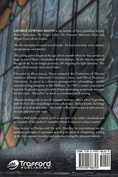 Miller's Pub is a fabricated tale. The characters in the plot are fictitious. Any resemblance of people, living or dead, is truly a coincidence. Certain historical events mentioned during the story's time line are repeated from memory and confirmed by the excellent internet site Wikipedia, the free encyclopedia. Steven Baker, the principal protagonist, finds himself unexpectedly in a midlife perplexity. Like many entrepreneurs absorbed by the pathways to success and often at the expense of others, he fails to properly recognize the traditional gap in their marriage. In all fairness, Steven may have been blindsided to this customary interval and unprepared to recognize and control it. Since the nineteen fifties, American culture, if there ever was such a thing, has gradually lost its former values. Now, relativism rules the day. Steven's grandparents lived by the precepts in the US Constitution and their Bible. The Good Book provided the roadmap for their way of life. The changing of society and environment has led to the decay of the old moral significance. Marriage and the family are disrupted and no longer a basic cultural element-it will never return. Today, relativism is taught in the universities of higher learning. The culture of Facebook and Twitter further limits the education of the populace. Their Bible, if they still have one, gathers dust. Any effort to return to our former lifestyle and virtues is shouted down by those in power.