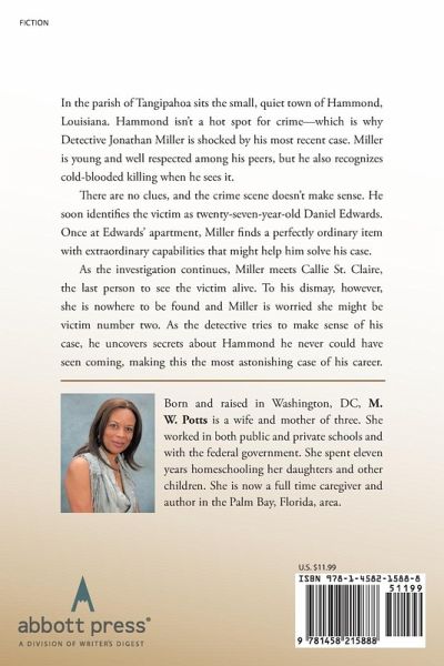 In the parish of Tangipahoa sits the small, quiet town of Hammond, Louisiana. Hammond isn't a hot spot for crime-which is why Detective Jonathan Miller is shocked by his most recent case. Miller is young and well respected among his peers, but he also recognizes cold-blooded killing when he sees it. There are no clues, and the crime scene doesn't make sense. He soon identi¿es the victim as twenty-seven-year-old Daniel Edwards. Once at Edwards' apartment, Miller ¿nds a perfectly ordinary item with extraordinary capabilities that might help him solve his case. As the investigation continues, Miller meets Callie St. Claire, the last person to see the victim alive. To his dismay, however, she is nowhere to be found and Miller is worried she might be victim number two. As the detective tries to make sense of his case, he uncovers secrets about Hammond he never could have seen coming, making this the most astonishing case of his career.