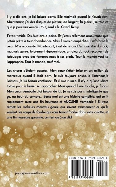 Il y a dix ans, je l’ai laissée partir. Elle m’aimait quand je n’avais rien. Maintenant, j’ai des disques de platine, de l’argent, la gloire. J’ai tout ce que je pourrais vouloir… tout, sauf elle. Cristal Kerry J'étais timide. Dix-huit ans à peine. Et j'étais tellement amoureuse que j'étais prête à tout abandonner. Mais il m'en a empêchée. Il m'a brisé le cœur. M'a repoussée. Maintenant, il est de retour. C'est une star du rock, mauvais genre, totalement égocentrique, un dieu du rock recouvert de tatouages avec des femmes nues à ses pieds. Tout le monde veut se l'approprier. Tout le monde, sauf moi. Les choses s'étaient passées. Mon cœur s'était brisé en un million de morceaux quand il était parti. Je suis toujours brisée, à l'intérieur. Je l'aimais. Je lui faisais confiance. Et il m'a ruinée. Il n'y a qu'une idiote totale pour le laisser se rapprocher. Mais quand il me touche, je fonds. Mon cœur s'emballe. J'ai besoin de lui. Je ne suis pas si intelligente que ça, au bout du compte... Berce-moi est une histoire complète, qui se lit rapidement avec une fin heureuse et AUCUNE tromperie ! Si vous aimez les rockeurs mauvais genre qui savent exactement ce qu’ils veulent, les coups de foudre qui vous feront fondre dans votre culotte, et une fin heureuse garantie, ce n’est qu’à un clic!