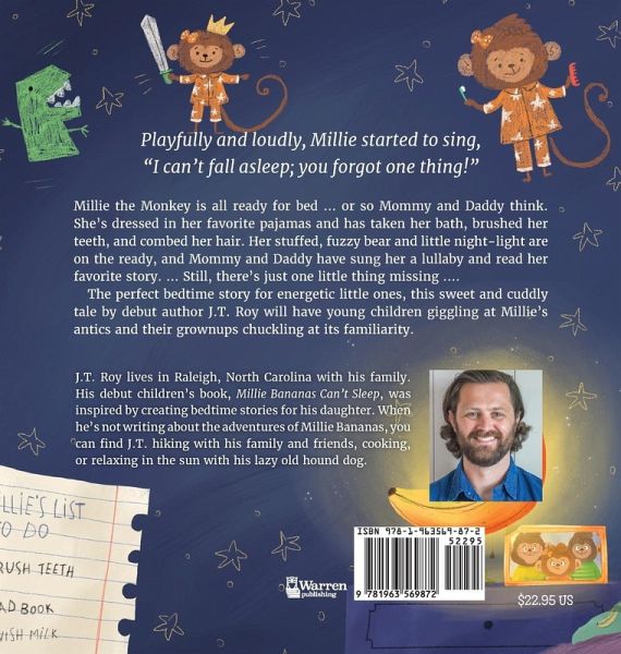 Millie the Monkey is all ready for bed ... or so Mommy and Daddy think. She's dressed in her favorite pajamas and has taken her bath, brushed her teeth, and combed her hair. Her stuffed, fuzzy bear and little night-light are on the ready, and Mommy and Daddy have sung her a lullaby and read her favorite story. ... Still, there's just one little thing missing .... The perfect bedtime story for energetic little ones, this sweet and cuddly tale by debut author J.T. Roy will have young children giggling at Millie's antics and their grownups chuckling at its familiarity.