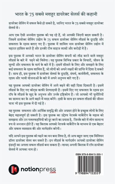 "Story of India's 75 Most Famous Direct Sellers" Learn how to succeed in direct selling from India's 75 most famous direct sellers. You are reading a priceless book that can change your life. It contains the secrets of vision and success of 75 successful leaders in the direct selling industry. This book includes the names of those who lead India's direct selling companies and whose teams are in the millions and billions. In this book, you will read about the famous leaders who lead India's direct selling companies. This book is about different ideas, values of life, and paths to success. It includes many secrets of success for learning and understanding, which can guide people towards achieving their goals. Along with this, in this book, the experiences, struggles, work style, secrets of success, and future plans of direct sellers are shared. This book shows you the right direction to move forward in direct selling. The quotes of leaders in it are very inspiring. The secrets of success given in it are based on the experiences and perspectives of these top leaders themselves. Which will help you face challenges and move forward. Along with this, the life journey of these successful leaders is also given in this book. This book can be very important for those interested in success and economic prosperity. The aim of this book is to understand the importance of network marketing and to dispel those misconceptions which people are generally unaware of. This book will guide you towards a better and successful business through network marketing.
