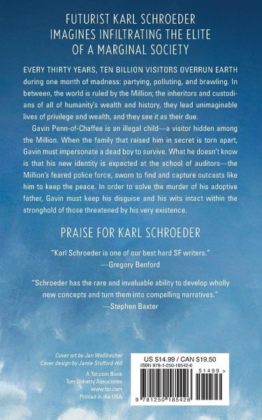 Futurist and award-winning author Karl Schroeder imagines infiltrating the elite of a marginal society in The Million. Every thirty years, ten billion visitors overrun Earth during one month of madness: partying, polluting, and brawling. In between, the world is ruled by the Million; the inheritors and custodians of all of humanity's wealth and history, they lead unimaginable lives of privilege and wealth, and they see it as their due. Gavin Penn-of-Chaffee is an illegal child-a visitor hidden among the Million. When the family that raised him in secret is torn apart, Gavin must impersonate a dead boy to survive. What he doesn't know is that his new identity is expected at the School of Auditors-the Million's feared police force, sworn to find and capture outcasts like him to keep the peace. In order to solve the murder of his adoptive father, Gavin must keep his disguise and his wits intact within the stronghold of those threatened by his very existence.