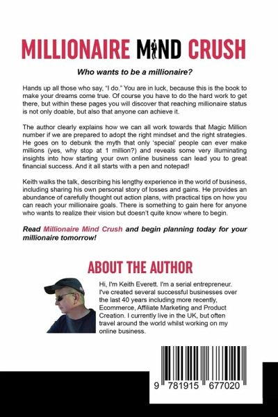 THINK BIG * THINK LIKE A MILLIONAIRE * YOU Have The POWER To Be Rich! The author of MONEY MIND CRUSH is back, this time with a power in his punch that you won't have seen in any other books of this genre. In this book, Keith clearly explains how we can all work towards that Magic Million number if we are prepared to adopt the right mindset and the right strategies. He goes on to debunk the myth that only 'special' people can ever make millions (yes, why stop at 1 million?) and reveals some very illuminating insights into how starting your own online business can lead you to great financial success. It all starts with a pen and notepad! ARE YOU READY FOR THIS? Keith walks the talk, he describes his lengthy experience in the world of business, (over 40years) including sharing his own personal story of losses and gains. He even tells you about the day he personally lost $250,000 (yes, in one day) and how he mentally recovered from that. He provides an abundance of carefully thought-out action plans, with tried and tested practical tips on how you can reach your millionaire goals. Each chapter is packed with a mix of personal anecdotes, a large dose of business acumen, and some insider tips that have been a well-kept secret for far too long. Keith tells you how to grow that 'millionaire mentality' and goes on to reveal multiple ways to grow your bank balance too. There is something in this book for everyone who wants to realize their vision and reach that MAGIC Million. GO FOR IT!. Read Millionaire Mind Crush today and begin planning today for your millionaire tomorrow!