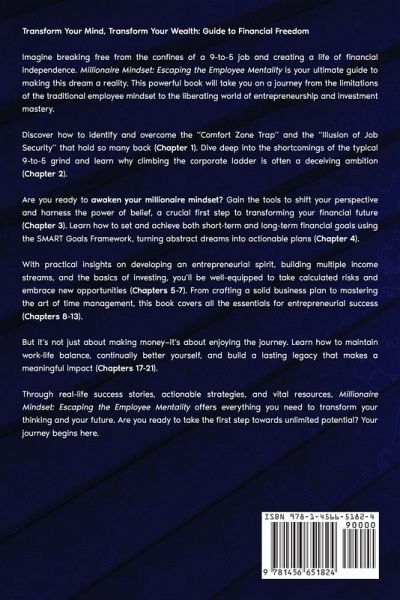 Transform Your Mind, Transform Your Wealth: Guide to Financial Freedom Imagine breaking free from the confines of a 9-to-5 job and creating a life of financial independence. Millionaire Mindset: Escaping the Employee Mentality is your ultimate guide to making this dream a reality. This powerful book will take you on a journey from the limitations of the traditional employee mindset to the liberating world of entrepreneurship and investment mastery. Discover how to identify and overcome the "Comfort Zone Trap" and the "Illusion of Job Security" that hold so many back (Chapter 1). Dive deep into the shortcomings of the typical 9-to-5 grind and learn why climbing the corporate ladder is often a deceiving ambition (Chapter 2). Are you ready to awaken your millionaire mindset? Gain the tools to shift your perspective and harness the power of belief, a crucial first step to transforming your financial future (Chapter 3). Learn how to set and achieve both short-term and long-term financial goals using the SMART Goals Framework, turning abstract dreams into actionable plans (Chapter 4). With practical insights on developing an entrepreneurial spirit, building multiple income streams, and the basics of investing, you'll be well-equipped to take calculated risks and embrace new opportunities (Chapters 5-7). From crafting a solid business plan to mastering the art of time management, this book covers all the essentials for entrepreneurial success (Chapters 8-13). But it's not just about making money-it's about enjoying the journey. Learn how to maintain work-life balance, continually better yourself, and build a lasting legacy that makes a meaningful impact (Chapters 17-21). Through real-life success stories, actionable strategies, and vital resources, Millionaire Mindset: Escaping the Employee Mentality offers everything you need to transform your thinking and your future. Are you ready to take the first step towards unlimited potential? Your journey begins here.