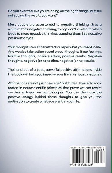 Are you tired of feeling stuck financially while you see other people succeed? Have you ever wondered why the rich seem to get richer and the poor seem to get poorer? It's frustrating to feel like you're doing all the right things, but still not seeing the results you want, as your financial dreams seem to get farther and farther away. Every time you make a step forward that seems financially promising, the car breaks down, the deal falls through, or something else happens to get you right back where you started. Have you ever felt like you can't get past a certain income level no matter what you do? In the book Secrets of Successful Selling, the author uses the example of a real salesman who always made the same amount of money every year. Whether given a lucrative territory, a challenging territory, whether commissions were increased or decreased, he always made the same amount of money regardless of changes in outside conditions. Why? The way he thought about himself (whether consciously or unconsciously) was the reason for his stagnation. He thought of himself as the kind of person who made that particular amount of money, so his actions always found a way to subconsciously align with his thoughts. We are all hypnotized whether we realize it or not, whether for good or bad. We are hypnotized by our beliefs about ourselves and our environment. And there lies the biggest difference between the wealthy and the not so wealthy. Your mindset makes all the difference. Negative thoughts about money, programmed into our heads all our lives, repel wealth and it is these very negative thoughts and beliefs that ultimate lead to unproductive or self-sabotaging behavior, that keeps you from being successful. Wealth is available to everyone, including you. Re-programming yourself with optimistic thoughts about yourself, positive thoughts about money, and strategies of the wealthy in order to adopt a millionaire mindset is the first and most important step in financial advancement. Without it, nothing can improve. This book contains over 1100 powerful positive affirmations to help you reprogram your mind in various categories. It will help you: Overcome limiting beliefs, see your worth, and expect good things to happen to you Change your relationship to money and develop an abundance mindset Take accountability and become an action taker Become a confident leader of yourself and others Unlock the keys to building and growing wealth And more... You can use this book in a multitude of ways: Read through and speak aloud the affirmations. Choose one of the affirmations to meditate on or use as a mantra in a meditation session. Get the audiobook, set to music, for best results and the flexibility to use this as call and response affirmations, a meditation background track, or subliminal hypnosis while you sleep, drive, or conduct everyday tasks. A 2019 survey found that despite living in one of the richest countries on earth, 64% of Americans will retire broke. Don't be one of them. Even if you've always been negative, are in a slump, or currently feel trapped under the weight of your disempowering thoughts, you can change your mind to ultimately change your life. Affirmations are not just "new age" platitudes. Their efficacy is rooted in neuroscientific principles that prove we can rewire our brains based on our thoughts. You can then use the positive energy behind those thoughts to give you the motivation to create what you want in your life. Take action now. Scroll up and click "buy now" to get this book and the audiobook version today.