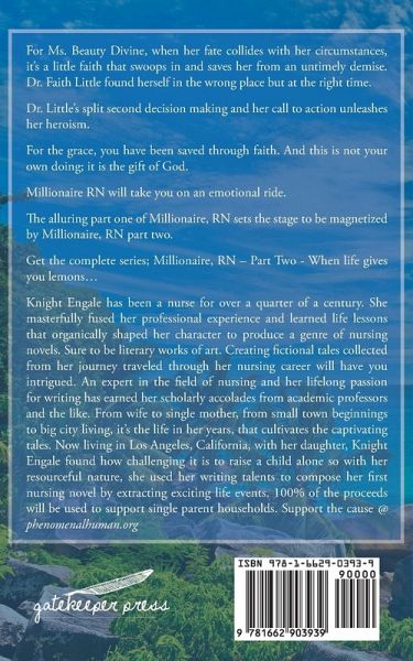 For Ms. Beauty Divine, when her fate collides with her circumstances, it's a little faith that swoops in and saves her from an untimely demise. Dr. Faith Little found herself in the wrong place but at the right time. Dr. Little's split second decision making and her call to action unleashes her heroism. For the grace, you have been saved through faith. And this is not your own doing; it is the gift of God. Millionaire RN will take you on an emotional ride. The alluring part one of Millionaire, RN sets the stage to be magnetized by Millionaire, RN part two. Get the complete series; Millionaire, RN - Part Two - When life gives you lemons... Knight Engale has been a nurse for over a quarter of a century. She masterfully fused her professional experience and learned life lessons that organically shaped her character to produce a genre of nursing novels. Sure to be literary works of art. Creating fictional tales collected from her journey traveled through her nursing career will have you intrigued. An expert in the field of nursing and her lifelong passion for writing has earned her scholarly accolades from academic professors and the like. From wife to single mother, from small town beginnings to big city living, it's the life in her years, that cultivates the captivating tales. Now living in Los Angeles, California, with her daughter, Knight Engale found how challenging it is to raise a child alone so with her resourceful nature, she used her writing talents to compose her first nursing novel by extracting exciting life events. 100% of the proceeds will be used to support single parent households. Support the cause @phenomenalhuman.org