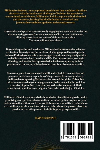 Millionaire Sudoku is not just a puzzle book; it's a captivating journey through the world of sudoku, intertwined with the elegance of fine art, designed to inspire readers to apply strategic thinking not only to puzzles but also to their life goals and aspirations. This meticulously crafted book elevates the traditional Sudoku experience to a luxurious realm of beauty, intellect, and personal growth. Each Sudoku puzzle within this exquisite collection is accompanied by breathtaking artwork reminiscent of what one might find gracing the walls of a millionaire's home or a prestigious art museum. The synergy between puzzle and art creates a unique theme for every challenge, each with its title, adding an extra layer of intrigue to the solving experience. The fusion of art and Sudoku serves as a metaphor for life itself. As readers engage with these puzzles and their accompanying artwork, they subtly absorb the principles of strategic problem-solving, patience, and perseverance-skills that are not only essential for conquering Sudoku grids but are also applicable to achieving one's ambitions and living a more fulfilling life. Millionaire Sudoku transcends the ordinary puzzle book. It encourages readers to contemplate the intricate balance between strategy and aesthetics, mirroring the delicate balance between pursuing one's passions and achieving success. With each solved puzzle, readers not only sharpen their Sudoku-solving skills but also gain insights into how these strategies can be transferred to overcome real-life challenges. Whether you're an avid Sudoku enthusiast seeking a novel experience or someone looking for a thoughtful gift that combines art and intellect, Millionaire Sudoku invites you to embark on a captivating journey where puzzles and art converge, offering inspiration and life lessons along the way. So, immerse yourself in this opulent world of puzzles, art, and self-discovery, and unlock the keys to both Sudoku mastery and a more fulfilling life.