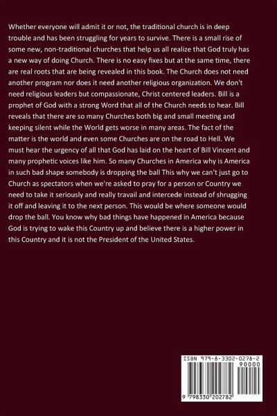 Whether everyone will admit it or not, the traditional church is in deep trouble and has been struggling for years to survive. There is a small rise of some new, non-traditional churches that help us all realize that God truly has a new way of doing Church. There is no easy fixes but at the same time, there are real roots that are being revealed in this book. The Church does not need another program nor does it need another religious organization. We don't need religious leaders but compassionate, Christ centered leaders. Bill is a prophet of God with a strong Word that all of the Church needs to hear. Bill reveals that there are so many Churches both big and small meeting and keeping silent while the World gets worse in many areas. The fact of the matter is the world and even some Churches are on the road to Hell. We must hear the urgency of all that God has laid on the heart of Bill Vincent and many prophetic voices like him. So many Churches in America why is America in such bad shape somebody is dropping the ball This why we can't just go to Church as spectators when we're asked to pray for a person or Country we need to take it seriously and really travail and intercede instead of shrugging it off and leaving it to the next person. This would be where someone would drop the ball. You know why bad things have happened in America because God is trying to wake this Country up and believe there is a higher power in this Country and it is not the President of the United States.