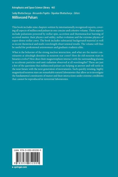 This book includes nine chapters written by internationally recognized experts, covering all aspects of millisecond pulsars in one concise and cohesive volume. These aspects include pulsations powered by stellar spin, accretion and thermonuclear burning of accreted matter, their physics and utility, stellar evolution and the extreme physics of super-dense stellar cores. The book includes substantial background material as well as recent theoretical and multi-wavelength observational results. The volume will thus be useful for professional astronomers and graduate students alike. What is the behavior of the strong nuclear interaction, and what are the matter constituents at ultrahigh densities in neutron star cores? How do old neutron stars in binaries evolve? How does their magnetosphere interact with the surrounding plasma to accelerate particles and emit radiation observed at all wavelengths? These are just a few of the questions that millisecond pulsarsare helping us answerand will settle in the near future with the next generation of instruments. Such quickly rotating, highly magnetized neutron stars are remarkable natural laboratories that allow us to investigate the fundamental constituents of matter and their interactions under extreme conditions that cannot be reproduced in terrestrial laboratories.
