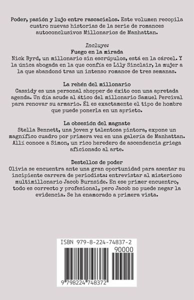 Poder, pasión y lujo entre rascacielos. Este volumen recopila cuatro nuevas historias de la serie de romances autoconclusivos Millonarios de Manhattan. Incluye: Fuego en la mirada Nick Byrd, un millonario sin escrúpulos, está en la cárcel. Y la única abogada en la que confía es Lily Sinclair, la mujer a la que abandonó tras un intenso romance de tres semanas. La rehén del millonario Cassidy es una personal shopper de éxito con una apretada agenda. Un día acude al ático del millonario Samuel Percival para renovar su armario. Él es exactamente el tipo de hombre que puede ponerla en un aprieto. La obsesión del magnate Stella Bennett, una joven y talentosa pintora, expone un magnífico cuadro por primera vez en una galería de Manhattan. Allí conoce a Simon, un rico heredero de ascendencia griega aficionado al arte. Destellos de poder Olivia se encuentra ante una gran oportunidad para asentar su incipiente carrera de periodista: entrevistar al misterioso multimillonario Jacob Burnside. En ese primer encuentro, todo es correcto y profesional, pero Jacob no puede negar la evidencia. Se ha enamorado a primera vista.