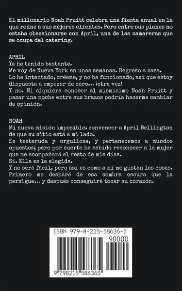 El millonario Noah Pruitt celebra una fiesta anual en la que reúne a sus mejores clientes. Pero entre sus planes no estaba obsesionarse con April, una de las camareras que se ocupa del catering. APRIL Ya he tenido bastante. Me voy de Nueva York en unas semanas. Regreso a casa. Lo he intentado, créeme, y no ha funcionado, así que estoy dispuesta a empezar de cero… ¡otra vez! Y no. Ni siquiera conocer al mismísimo Noah Pruitt y pasar una noche entre sus brazos podría hacerme cambiar de opinión. NOAH Mi nueva misión imposible: convencer a April Bellington de que su sitio está a mi lado. Es testaruda y orgullosa, y pertenecemos a mundos opuestos; pero por suerte he sabido reconocer a la mujer que me acompañará el resto de mis días. Sí. Ella es la elegida. Y no será fácil, pero así es como a mí me gustan las cosas. Primero me desharé de esa sombra oscura que la persigue… y después conseguiré tocar su corazón.