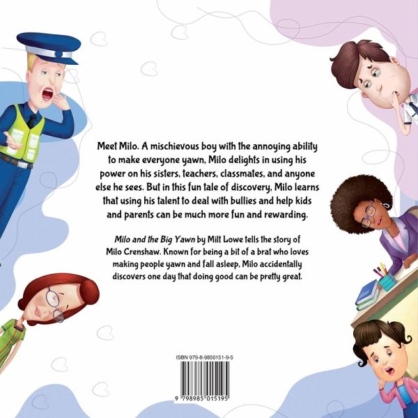Meet Milo. A mischievous boy with the annoying ability to make everyone yawn, Milo delights in using his power on his sisters, teachers, classmates, and anyone else he sees. But in this fun tale of discovery, Milo learns that using his talent to deal with bullies and help kids and parents can be much more fun and rewarding. Milo and the Big Yawn by Milt Lowe tells the story of Milo Crenshaw. Known for being a bit of a brat who loves making people yawn and fall asleep, Milo accidentally discovers one day that doing good can be pretty great.