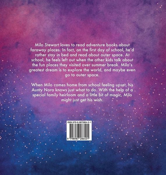 Milo Stewart loves to read adventure books about faraway places. In fact, on the first day of school, he'd rather stay in bed and read about outer space. At school, he feels left out when the other kids talk about the fun places they visited over summer break. Milo's greatest dream is to explore the world, and maybe even go to outer space. When Milo comes home from school feeling upset, his Aunty Nora knows just what to do. With the help of a special family heirloom and a little bit of magic, Milo might just get his wish.