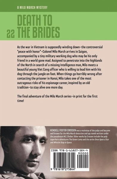 Death to the Brides was completed in 1975 but never released during the author's lifetime, owing to the publisher's objection to its politically charged content. So this is the only unpublished Milo March manuscript left by Ken Crossen-now in print for the first time. The book is distinctive in another way. It is the only Crossen book in which characters from two different series interact. Colonel Kim Locke, featured in three other spy novels by Crossen, lends Milo a miniature-breed military dog for an Intelligence mission. Milo has never worked with a canine before, but man and dog quickly take to each other, and the dog will soon prove himself a valuable friend in a world gone mad. The American war against the Viet Cong is supposedly over now, and the only U.S. personnel in the South are advisors and attachés. Milo arrives under cover as the new military attaché, assigned to rescue an Intelligence man held captive in the highlands of the North. He decides to present himself to the Communists as an American officer who has come to plead for the release of the prisoner on the humanitarian grounds that he is a civilian and a personal friend who was captured while on an errand of peace. But how to reach Hanoi safely? An informant sends him to Madame Lê, a beautiful young Chinese Vietnamese woman who is a restaurateur and an officer of the Viet Cong. She is willing to guide Milo on an arduous walk through the jungle. Mindful of the possibility that Madame Lê or her comrades may lure him into the hands of the Viet Cong, to be thrown into the same cell with the American he came to rescue, Milo is taken by surprise when the real danger comes from a completely unexpected quarter. Milo, who never make plans in advance-except the plan to stay alive one more day-embarks on one of the craziest stunts of his espionage career. And the little dog holds the key.