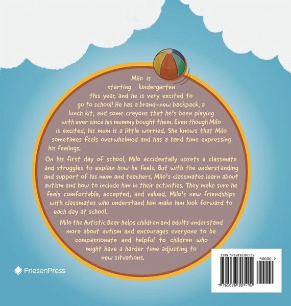Milo is starting kindergarten this year, and he is very excited to go to school! He has a brand-new backpack, a lunch kit, and some crayons that he's been playing with ever since his mummy bought them. Even though Milo is excited, his mum is a little worried. She knows that Milo sometimes feels overwhelmed and has a hard time expressing his feelings. On his first day of school, Milo accidentally upsets a classmate and struggles to explain how he feels. But with the understanding and support of his mum and teachers, Milo's classmates learn about autism and how to include him in their activities. They make sure he feels comfortable, accepted, and valued. Milo's new friendships with classmates who understand him make him look forward to each day at school. Milo the Autistic Bear helps children and adults understand more about autism and encourages everyone to be compassionate and helpful to children who might have a harder time adjusting to new situations.