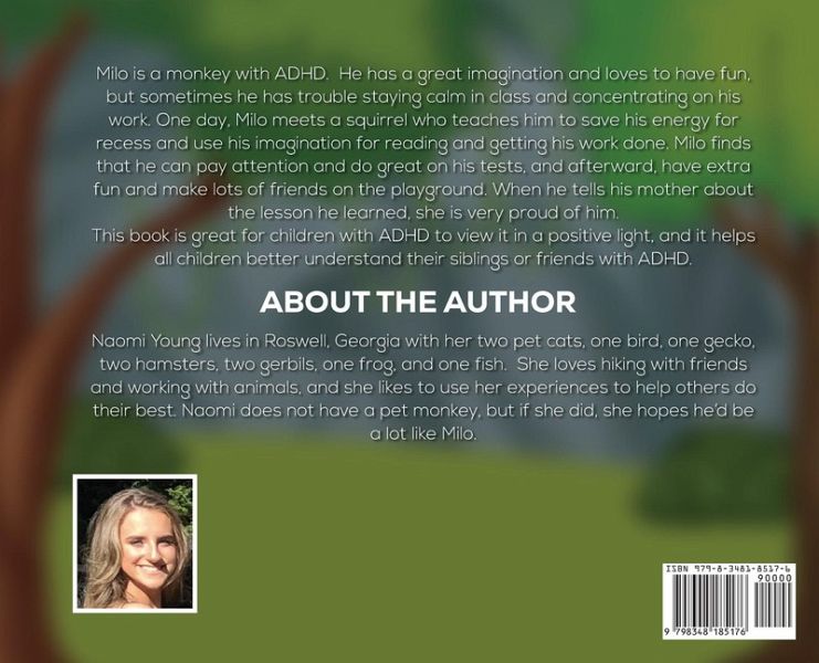 Milo is a monkey with ADHD. He has a great imagination and loves to have fun, but sometimes he has trouble staying calm in class and concentrating on his work. One day, Milo meets a squirrel who teaches him to save his energy for recess and use his imagination for reading and getting his work done. Milo finds that he can pay attention and do great on his tests, and afterward, have extra fun and make lots of friends on the playground. When he tells his mother about the lesson he learned, she is very proud of him. This book is great for children with ADHD to view it in a positive light, and it helps all children better understand their siblings or friends with ADHD.