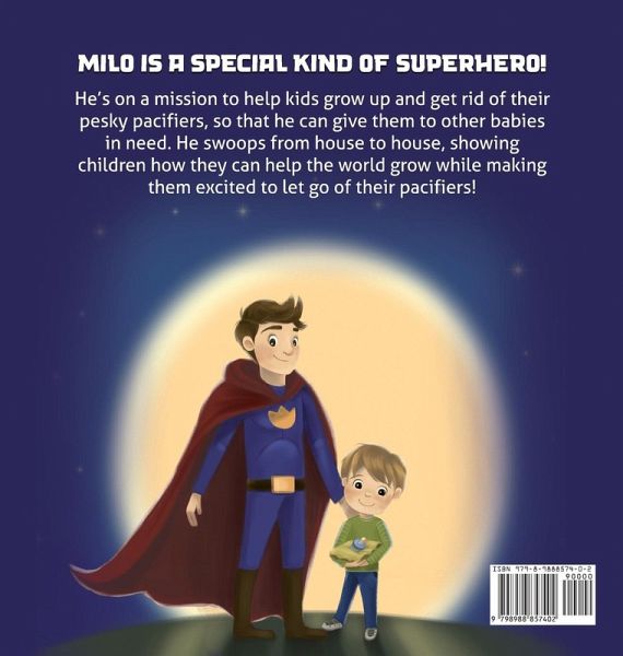 Dive into an adorable superhero story that inspires kids to say goodbye to their pacifiers! Milo is a special kind of superhero! He's on a mission to help kids grow up and get rid of their pesky pacifiers, so that he can give them to other babies in need. He swoops from house to house, showing children how they can help the world and making them excited to let go of their pacifiers! Featuring a lovely rhyming narrative and colorful illustrations that leap from every page, this fun and fantastical superhero story inspires boys & girls to give up their pacifiers and embrace growing up. With a wonderful adventure that's perfect for bedtime stories and bonding with your child, Milo The Pacifier Hero encourages kids to let go of their pacifiers without the stress and tears that often accompany pacifier weaning. Book details: Shares a Beautifully Written Rhyming Story With Gorgeous Illustrations That Will Delight Young Children Perfect For Young Children, Babies, & Toddlers Ages 2-4 Imparts an Important Message About Growing Up, Finding New Interests, & Embracing Maturity Helps Parents Avoid unnecessary Stress & Difficulty With a Fun and Engaging Story Makes a Great Book For First-Time Moms or Dads Who Want To Wean Their Child Off Pacifiers And Much More... So if you're searching for a colorful adventure that will help you encourage your child with the confidence and maturity they need to say goodbye to their pacifier, this delightful story is a memorable read that will spark important conversations for your child's emotional development. Are you ready to discover the story of Milo the Pacifier Superhero? Then scroll up and order your copy today!