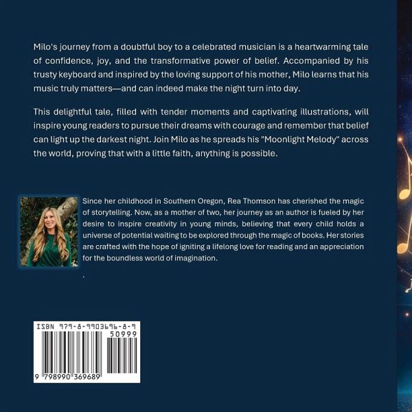 Milo's journey from a doubtful boy to a celebrated musician is a heartwarming tale of confidence, joy, and the transformative power of belief. Accompanied by his trusty keyboard and inspired by the loving support of his mother, Milo learns that his music truly matters-and can indeed make the night turn into day. This delightful tale, filled with tender moments and captivating illustrations, will inspire young readers to pursue their dreams with courage and remember that belief can light up the darkest night. Join Milo as he spreads his "Moonlight Melody" across the world, proving that with a little faith, anything is possible.