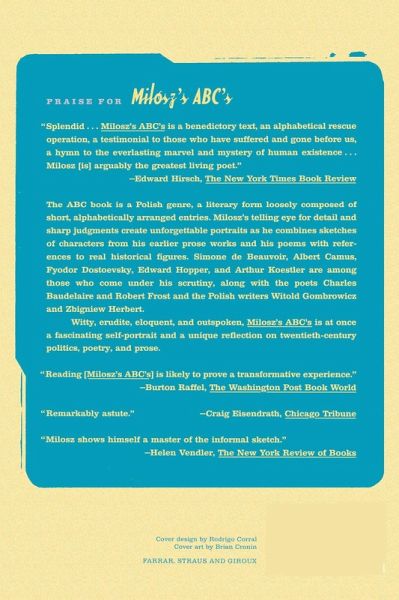 Memories, dreams and reflections from the Nobel Laureate The ABC book is a polish genre-a loose form related to a hypertext novel-composed of short, alphabetically arranged entries. In Milosz's conception, the ABC book becomes a sort of autobiographical reference book, combining entries concerning characters from his earlier work with references to some of his memory poems. He also writes of real, historical figures like Camus who were particularly influential during his formative years, and of broader topics such as "The City," "Unhappiness," and "Money." Another fascinating entry in Milosz's bold opus, Milosz's ABCs is an engaging tribute to a brilliant mind.
