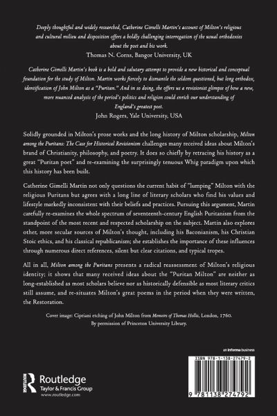 Solidly grounded in Milton's prose works and the long history of Milton scholarship, Milton among the Puritans: The Case for Historical Revisionism challenges many received ideas about Milton's brand of Christianity, philosophy, and poetry. It does so chiefly by retracing his history as a great "Puritan poet" and reexamining the surprisingly tenuous Whig paradigm upon which this history has been built. Catherine Martin not only questions the current habit of "lumping" Milton with the religious Puritans but agrees with a long line of literary scholars who find his values and lifestyle markedly inconsistent with their beliefs and practices. Pursuing this argument, Martin carefully reexamines the whole spectrum of seventeenth-century English Puritanism from the standpoint of the most recent and respected scholarship on the subject. Martin also explores other, more secular sources of Milton's thought, including his Baconianism, his Christian Stoic ethics, and his classical republicanism; she establishes the importance of these influences through numerous direct references, silent but clear citations, and typical tropes. All in all, Milton among the Puritans presents a radical reassessment of Milton's religious identity; it shows that many received ideas about the "Puritan Milton" are neither as long-established as most scholars believe nor as historically defensible as most literary critics still assume, and resituates Milton's great poems in the period when they were written, the Restoration.