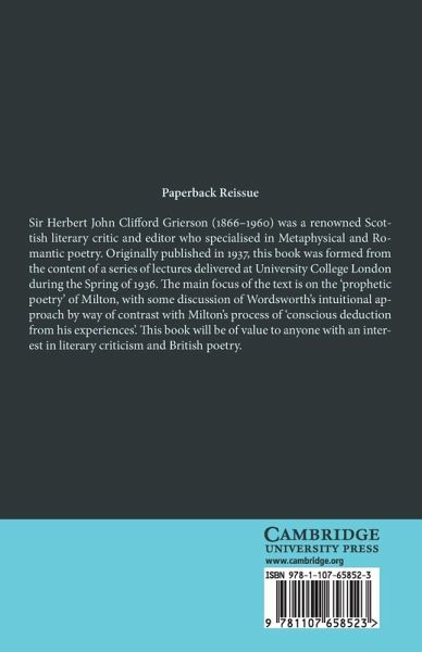 Sir Herbert John Clifford Grierson (1866-1960) was a renowned Scottish literary critic and editor who specialised in Metaphysical and Romantic poetry. Originally published in 1937, this book was formed from the content of a series of lectures delivered at University College London during the spring of 1936. The main focus of the text is on the 'prophetic poetry' of Milton, with some discussion of Wordsworth's intuitional approach by way of contrast with Milton's process of 'conscious deduction from his experiences'. This book will be of value to anyone with an interest in literary criticism and British poetry.