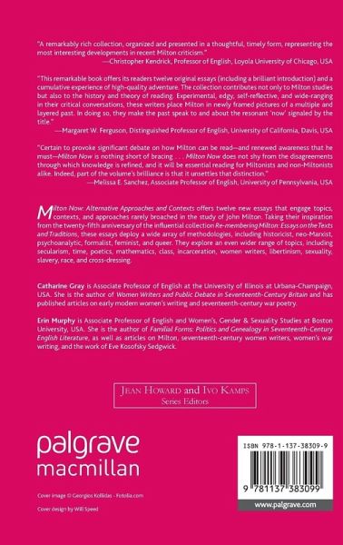 "Certain to provoke significant debate on how Milton can be read and renewed awareness that he must Milton Now is nothing short of bracing. Milton's own words in Areopagitica furnish an apt account of the value of this volume: 'Where there is much desire to learn, there of necessity will be much arguing, much writing, many opinions; for opinion in good men is but knowledge in the making.' Milton Now does not shy from the disagreements through which knowledge is refined, and it will be essential reading for Miltonists and non-Miltonists alike. Indeed, part of the volume's brilliance is that it unsettles that distinction." - Melissa E. Sanchez, Associate Professor of English, University of Pennsylvania, USA