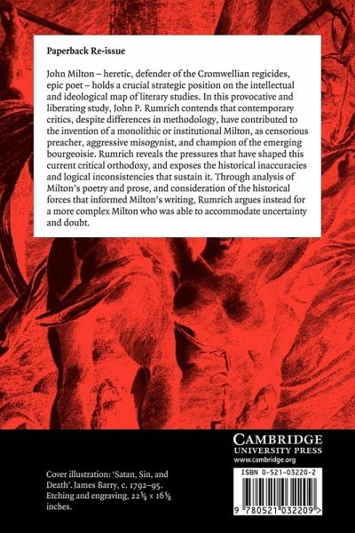 John Milton - heretic, defender of the Cromwellian regicides, epic poet - holds a crucial strategic position on the intellectual and ideological map of literary studies. In this provocative and liberating study, John P. Rumrich contends that contemporary critics, despite differences in methodology, have contributed to the invention of a monolithic or institutional Milton, as censorious preacher, aggressive misogynist, and champion of the emerging bourgeoisie. Rumrich reveals the pressures that have shaped this current critical orthodoxy, and exposes the historical inaccuracies and logical inconsistencies that sustain it. Through analysis of Milton's poetry and prose, and consideration of the historical forces that informed Milton's writing, Rumrich argues instead for a more complex Milton who was able to accommodate uncertainty and doubt.